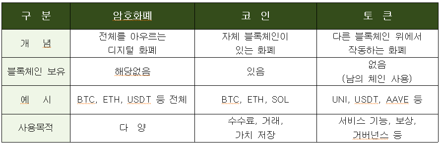 안녕하세요? 티끌모아 태산, 티끌입니다. 요즘 블록체인과 가상자산에 대한 관심이 높아지면서 암호화폐, 코인, 토큰이라는 단어들을 자주 접하게 됩니다. 그런데 이 세 가지가 어떤 차이가 있는지 헷갈리신 적 없으셨나요?오늘은 이 용어들을 아주 쉽게 구분해서 정리해드릴게요~ 암호화폐란?암호화폐는 블록체인 기술을 기반으로 만들어진 디지털 화폐 전체를 의미해요. 암호 기술로 보호되고분산 네트워크에서 거래되며중앙 기관 없이도 운영되는 특징이 있죠. 즉 코인과 토큰을 모두 포함하는 가장 큰 개념입니다. 예 :비트코인(BTC), 이더리움(ETH), 유니스왑(UNI), 테더(USDT) 등 코인이란?코인은 자체 블록체인을 가지고 있는 암호화폐입니다.이 말은 곧, 자기만의 독립된 네트워크를 운영한다는 뜻이예요.주..