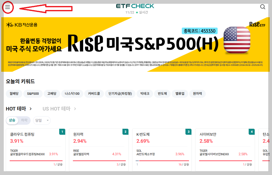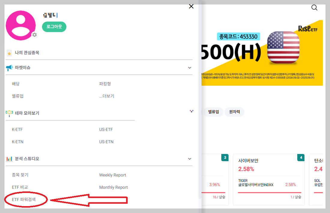 내가 원하는 조건의 ETF를 찾고 싶다면 'ETF파워검색' 메뉴를 이용하면 됩니다. 메인화면 상단 삼선 선택<분석 스튜디오<ETF파워검색으로 들어갑니다.