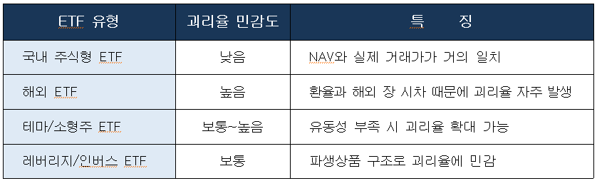 - 유동성 낮거나 해외 ETF일수록 괴리율 주의 필요