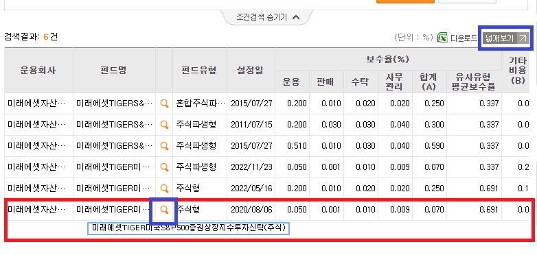 펀드명이 잘 안 보이시죠? 펀드명 목록에 커서를 가져다대면 펀드명이 나타나는데 미래에셋TIGER미국S&P500증권상장지수투자신탁(주식)이라고 나오는 항목을 보시면 됩니다. 넓게 보기를 눌러 그 라인을 보셔도 되고 아니면 돋보기를 눌러 펀드요약정보 팝업창을 띄워서 보셔도 됩니다.