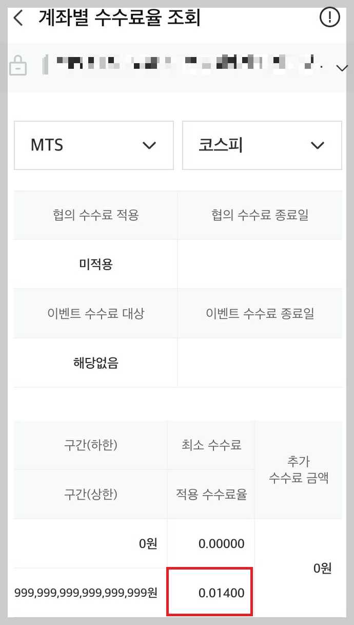 (왼쪽하단)메뉴 三 > 준비하기 > ID/계좌관리 > MY정보 > 내 수수료 > 계좌별 수수료율 조회