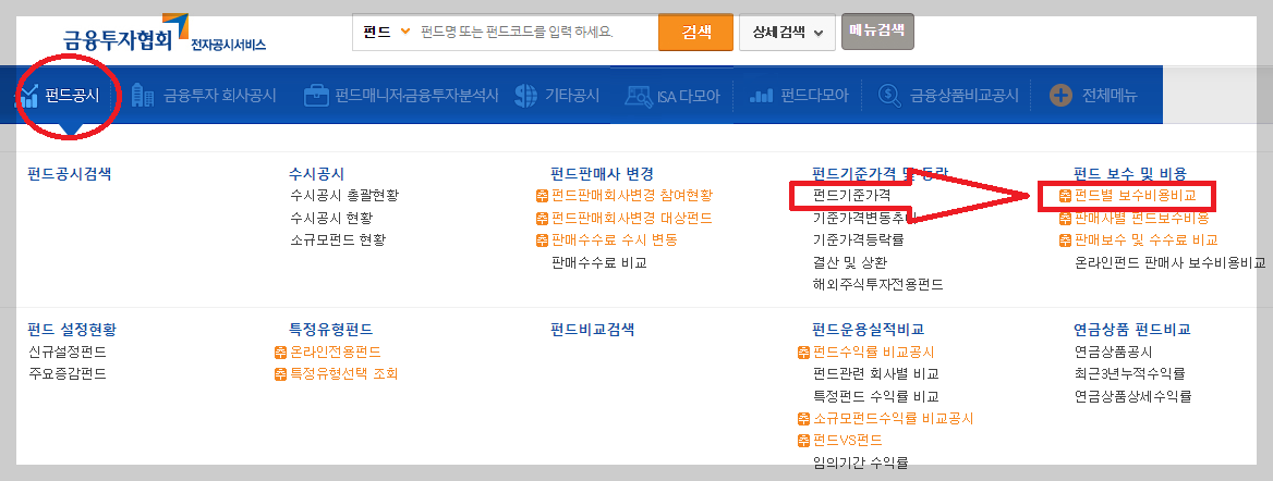 TIGER 미국S&P500 운용수수료를 조회하는 방법 중 금융투자협회 전자공시서비스를 이용하는 방법에 대해 알아보겠습니다. 검색창에 "금융투자협회 전자공시서비스"를 조회하여 사이트에 들어갑니다. 화면 좌측 상단 펀드공시를 선택하면 아래에 메뉴가 펼쳐집니다. 그중 우측에 있는 펀드별 보수비용비교를 선택합니다.